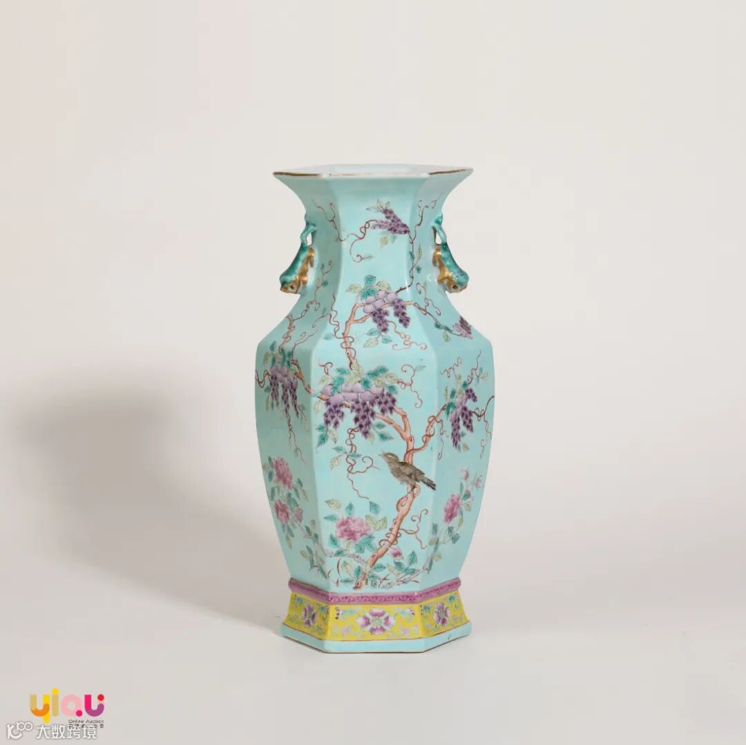 松石绿地粉彩藤萝花鸟纹六方瓶