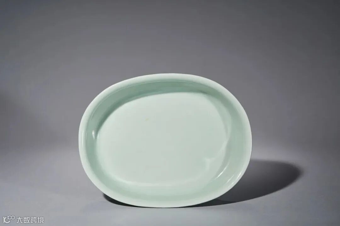 拍品造型别致,仿自宋代官窑、汝窑之水仙盆样式。通体施豆青釉,口呈椭圆形,口沿外侈,向下愈收直至炉底,下承四个云头纹足,盆身暗刻云蝠纹,寓意洪福齐天。自明代始,瓷器、铜器、掐丝珐琅器、玉器等等作品之中,均有此种形制作品出现,可资参考。