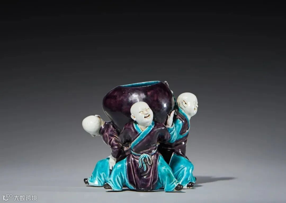 拍品造型新颖,为三名孩童屈膝站立,共同背起一只寿桃,诸童脸庞圆润,体形丰腴,身着蓝紫衣,富有趣致,洗仿桃形,惟妙惟肖。整体雕塑手法细腻生动,清新自然。童子背桃这一艺术形式将此水洗之精巧设计突显,可谓别具匠心。