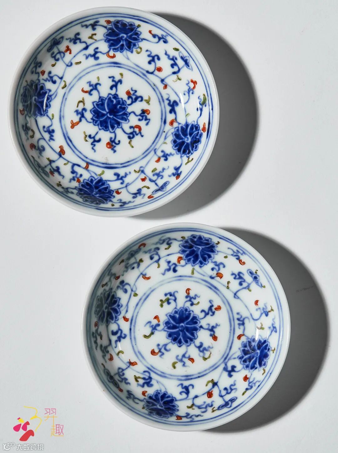 LOT223 民国 青花加彩缠枝莲纹盘一对