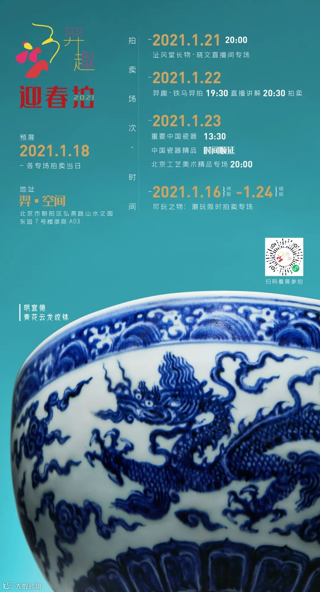 “羿趣·迎春拍”作为2021年度的首场艺术品拍卖会,囊括的门类丰富多元、估价适中,既有当下我们的成熟板块——瓷器工艺品,也将会呈现诸如中国书画、潮玩、杂项工艺品等等多元化的板块。在拍卖形式上,“羿趣·迎春拍”将会推出潮玩限时拍、直播讲解拍卖和同步拍,让您尽情享受竞拍的乐趣,让拍卖更“好玩”!