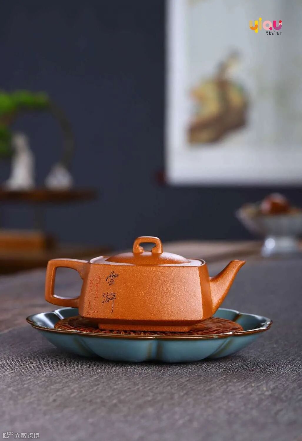 壶身上下呈方型,但棱角挖除,以弧形装点,显得大方得体,圆润有度,龙腾之势全然而生。壶底平稳,稳重踏实且气韵顿生。壶盖嵌盖,光亮平滑,壶钮以龙头装饰,霸气雄浑。壶嘴和龙型壶把遥想相对,纤细修长,尤显其生动洗练。寓意美好。壶身反面篆刻的 “酒是僲家事,茶言禅者心”,笔法高古冷逸,其意是赞茶,也是参禅,另一面的老者品茶与此相呼应。