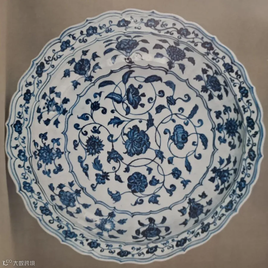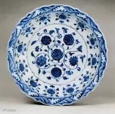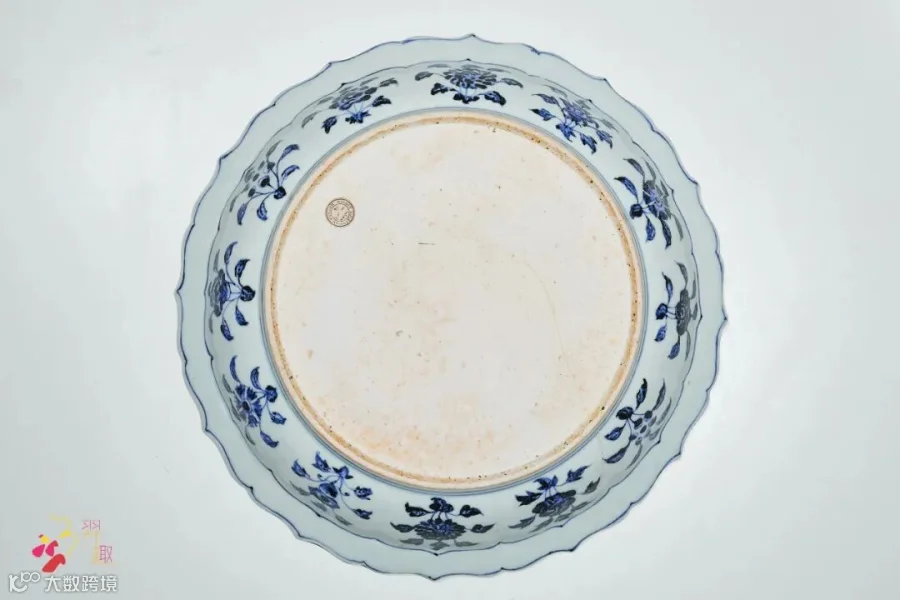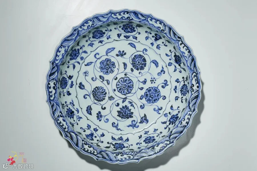 此盘为明永乐官窑经典品种,敞口弧腹,底承圈足。通体罩施白釉,其上以青花为饰,其主体纹样为缠枝莲纹,绘画流畅,釉色肥莹,青花呈色极富层次,铁锈斑深入胎骨,为永乐青花典范之作。