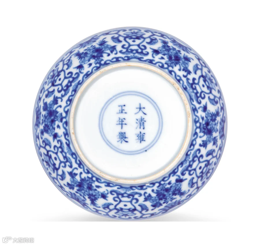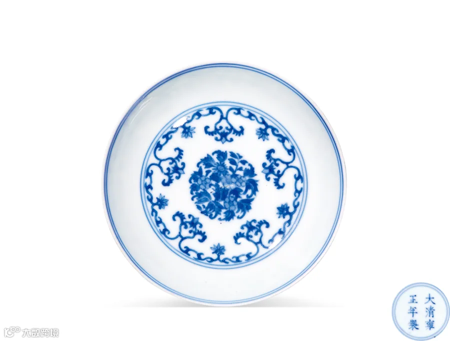 此对盘敞口,弧壁,圈足。里外以青花描画缠枝花卉纹。底足呈泥鳅背状。足内有青花双圈“大清雍正年制”六字双行楷书款。此盘是雍正官窑青花的精品之一,制作工艺细腻,图案繁复,讲究和谐对称,表现出一种新的装饰风格,除青花外,传世的还有斗彩品种。