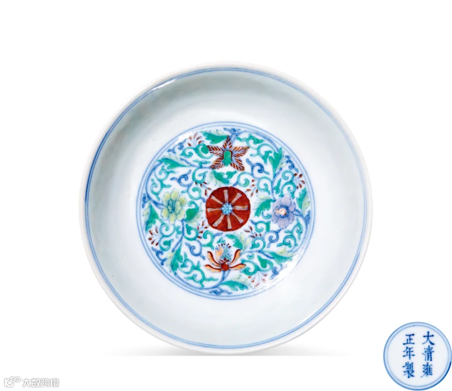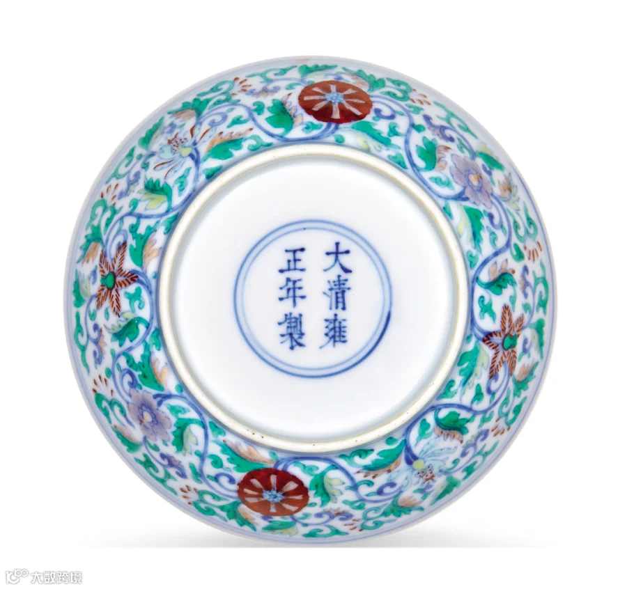 盘心绘斗彩折枝花卉五朵,以红色花卉为中心对称分布。外壁亦对称绘四种花朵图案,以青花勾画枝蔓,绿彩填涂翠叶,矾红绘花瓣,花蕊则以釉下青花与釉上黄、绿二色点缀,青花艳丽,彩釉典雅,为雍正时期斗彩瓷器的典型风格。其布局清新疏朗,填色精准,诸彩交映出淡雅柔和、臻于至美的内廷恭造风格。其型轻盈优美,修胎极为规整考究,胎釉浑然一体,丽质非凡,荡漾出雍正御瓷独有的阴柔婉约之气,为西洋纹饰与中国制瓷技术交汇之佳作。十八世纪,清宫盛行西洋风,诸项宫廷艺术品的装饰皆不同程度融入西洋元素,瓷器一项钟情以洋花洋草入饰,效果新奇别致,展示出御瓷纹饰设计的新姿彩。彼时雍正御窑斗彩瓷器,不但以仿明成化斗彩为能事,而且喜爱运用当时欧洲流行的洛可可手法表现西洋花草,成为雍正彩瓷之中瑰丽新颖的一类。