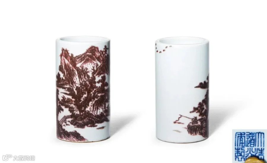 自古文人喜自由不羁,寄情山水间,往往濯发沧浪,放歌江海,或隐行简居,独钓天地。是次拍品【清道光釉里红山野高士垂钓图笔筒】形制小巧,盈盈可握,腹部以釉里红绘饰山水景致图。