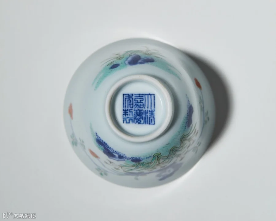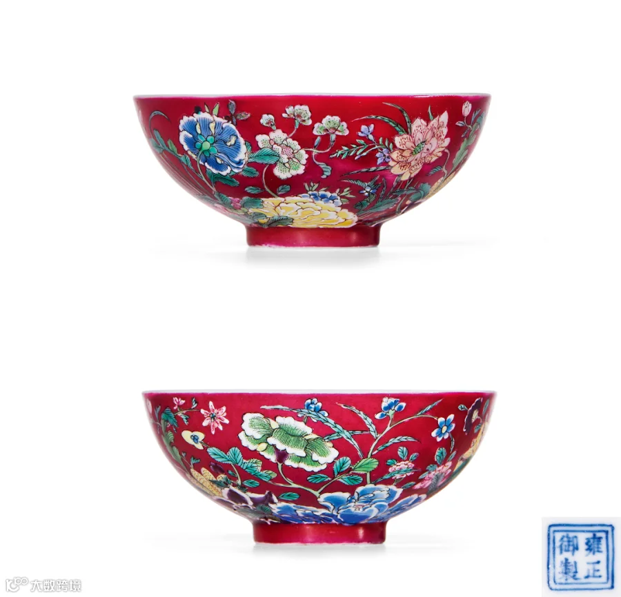 拍品造型源自明代茶钟,成化至嘉万时皆有所见,明清时期口径为九公分左右的小碗统称茶钟或小茶圆,由尺寸规定可知其原来用途。侈口弧壁,隽秀娇巧。胎体细薄坚致,内壁施白釉,温润莹美。外壁敷施胭脂红彩为地,色泽匀净浓妍,以诸色珐琅彩绘菊花、秋葵、芙蓉、秋海棠等九种秋季花卉,构成九秋图,寓意“九秋同庆”。间以绿彩和墨彩填绘勾描花叶、叶脉,风姿绰约,斑斓绚丽,花蕊、花心点画精细,侧视隐隐隆起,富有立体感,其中墨绿一色极为凝厚鲜亮,翠韵悠然,为后世所不及。碗底青花书“雍正御制”四字仿宋楷书款,外加双方框,亦与康熙朝形制一样,显然为雍正早期作品。