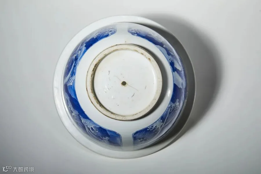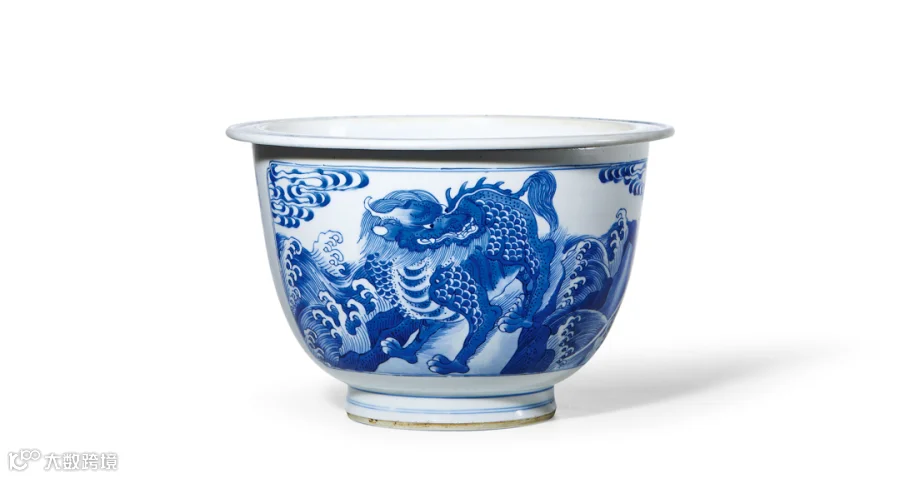 本拍品口沿厚重,器身略鼓,腹部略收,腹部开光绘海水瑞兽纹,海水翻滚,瑞兽矫健,神采飞扬,颇具气势。整体用笔流畅,画面布局层次清晰,青花鲜丽明快、浓淡相宜,以分水法作出幽菁清新、浓淡相宜的渲染,表现海水之立体感,为康熙“蓝分五色”的典型代表,可谓是康熙青花器之范本,不为多见。整器胎体坚质细糯,通体施釉平滑明润,绘画流畅,绘制精细,加之此器形卷缸较为少见,为康熙时期青花文房器之佳作,具有极高的欣赏收藏价值。