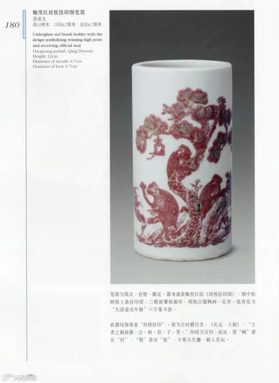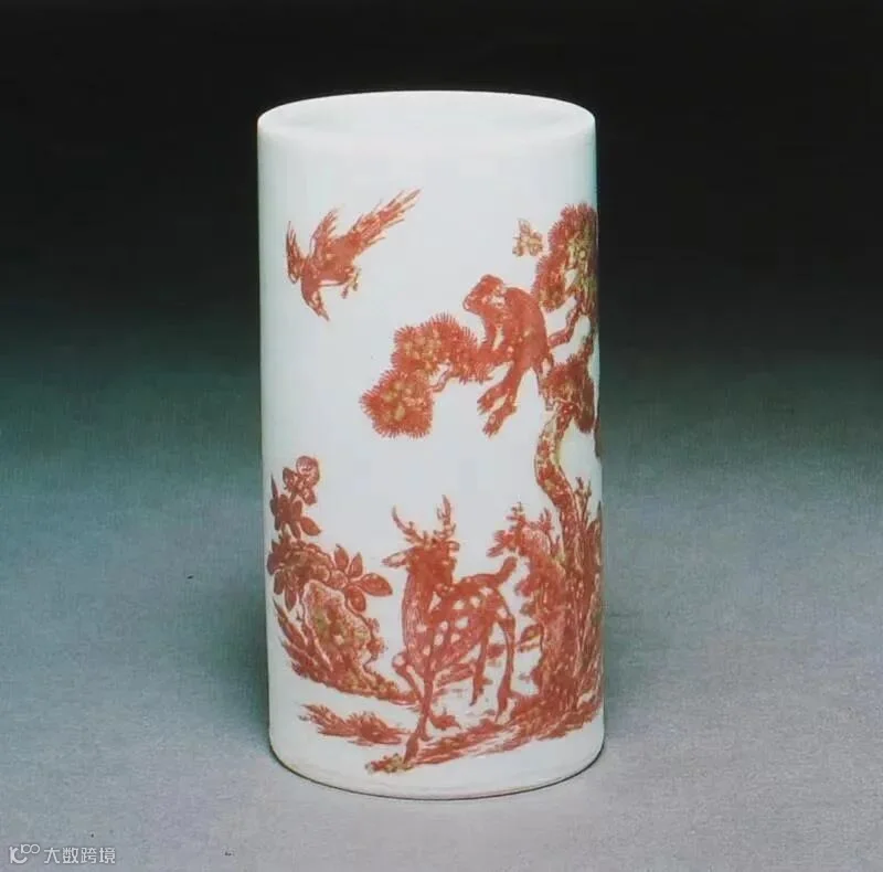 综览公私典藏,道光御瓷釉里红笔筒目前存世仅有七例,尺寸造型一致,主题纹饰见有四类: