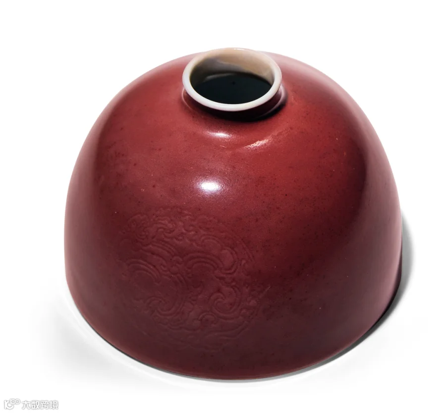 太白尊为康熙朝新创的文房名品,因造型酷似李白饮酒之尊而得名,为文房八大码专属,乃康熙朝组瓷之经典。传世品见有豇豆红釉、白釉品种,其中以豇豆红釉最为著名。豇豆红为康熙红釉中最名贵的品种,由于所施铜红釉敏感易变,烧成难度很大,故只由官窑少量生产,仅供宫廷使用,且无大件器物,其呈色半由天成,经常隐现深浅不同的斑点,正所谓“满身苔点,泛于桃花春浪间”、“莹润无比,居若鲜若黯之间,妙在难以形容也”。豇豆红釉器流传至今者甚少,其中大部分又在早年流散国外,收藏于各国著名的博物馆中,无论古今中外,皆为传世名品,更显本品之珍。拍品与故宫博物院和南京博物院藏品品种相同,造型端庄优美,胎质细润致密,釉下暗刻团螭纹,外壁满施豇豆红釉,釉色深沉雅静。