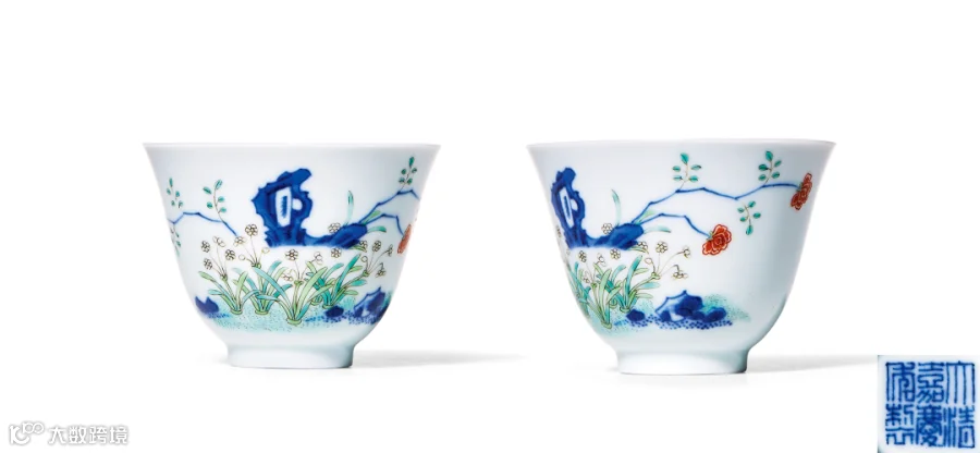拍品尺寸较小,通景绘画而无题诗,属于花神杯中最少见的纹饰,且为乾隆朝停烧后,恢复烧造之初的品种,较其后道光等朝制品更为少见。外壁以一月水仙花为题材,一面绘水仙团簇,绽放淡黄色花朵,洞石边伸出两三枝娇艳的月季花,另面亦绘一丛水仙。器形小巧别致,胎骨洁白,青花发色深沉浓艳,与釉上淡雅的敷彩对比强烈。