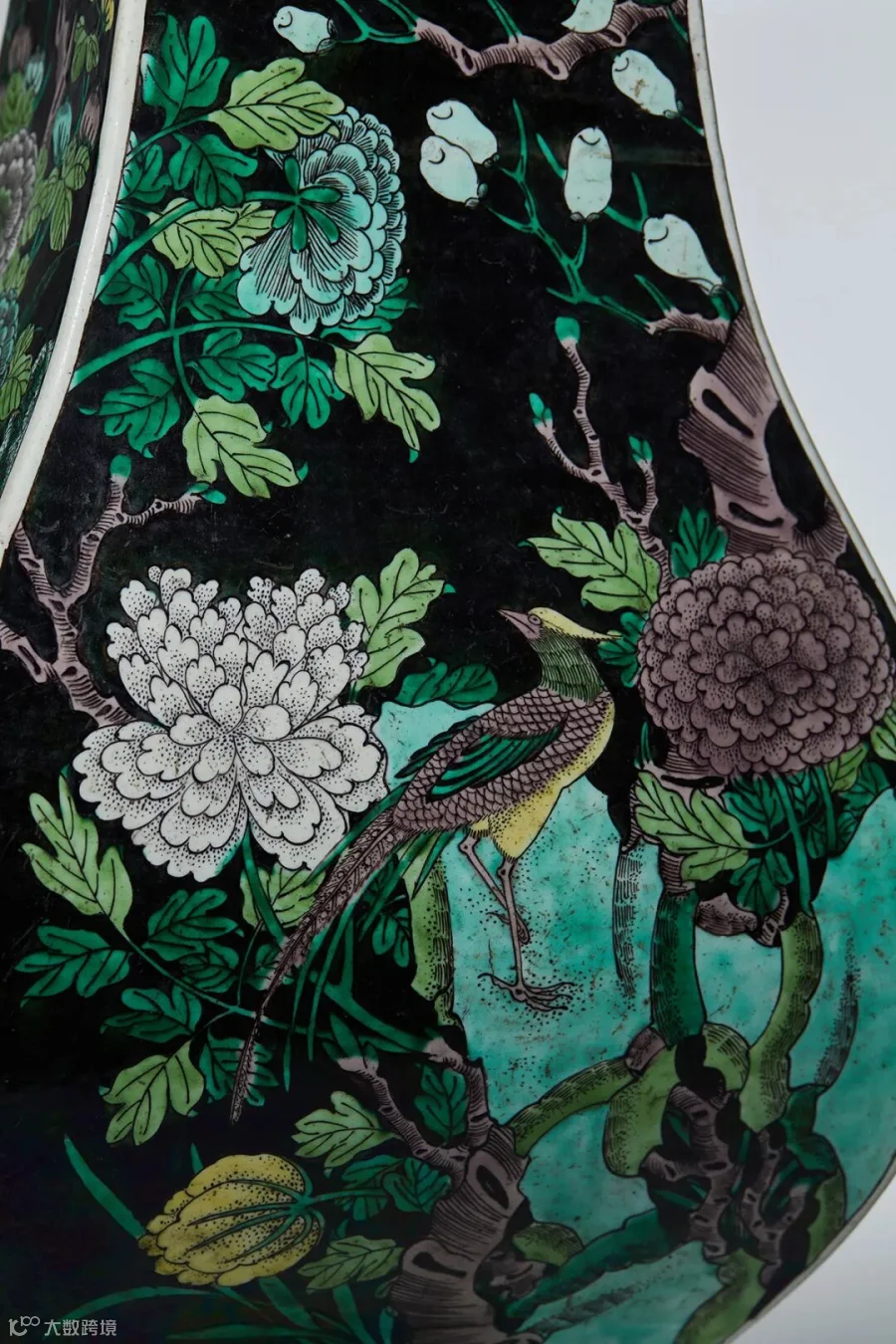 墨地三彩为素三彩的一类,是康熙三彩中最为名贵的一种。制器于黑色釉面上先用深紫色勾出图案轮廓,其内加绘黄、绿、紫三彩,传世少见,极其名贵。本品整体呈方形,直口折沿,长颈溜肩,四方弧腹下承外撇式高足,器型挺拔威武,线条简洁硬朗。瓶通体纹饰以墨地素三彩绘就,四面开光内绘花鸟纹饰,整个画面纹饰繁密有序,布局疏紧有致。花鸟相间分布,各有不同,花之娇嫩,尽善尽美。