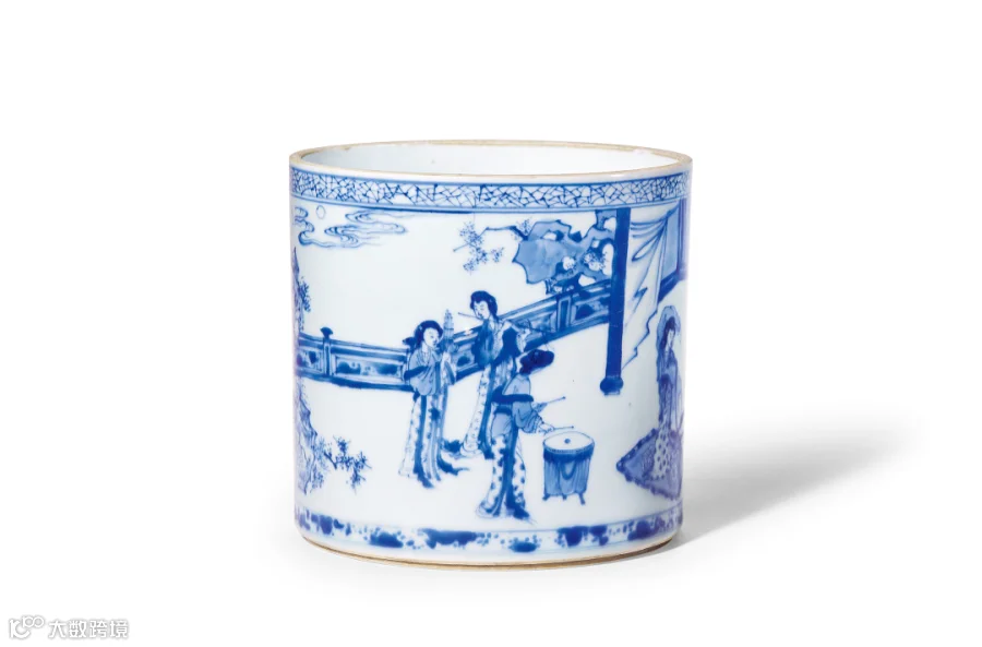 笔筒外壁以青花绘宴乐图,采用双线勾勒图案后填色的方法,借助康熙青花特有的描绘技巧——青花料浓淡分水,层层渲染,全图意境深远,布局繁复,人物刻画生动传神。整器釉质厚重致密,青花发色纯正,绘饰层次丰富,由于釉色光亮,且画法上勾、染、皴、擦并用,多可分出阴阳面及层次,故而本品应为康熙中期之作,堪称康熙民窑青花精品。