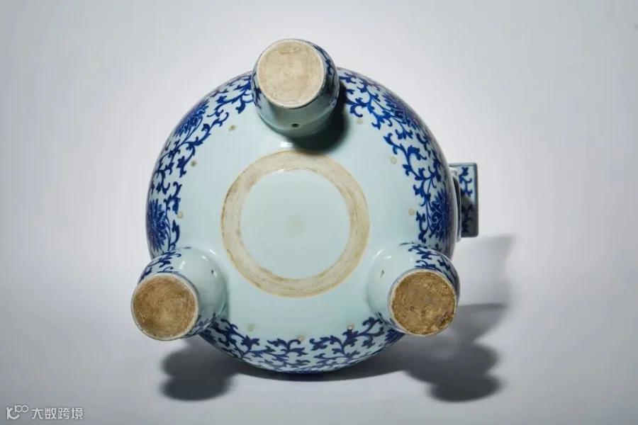 炉瓷质,大致作鼎形,通体满饰青花纹,体表施透明釉。其阔口平沿,厚壁,外折凸厚唇,唇外面饰回纹一周,中央部位以青花书“大清道光年制”六字单行篆书款;直颈外壁绘青花缠枝莲纹,腹鼓如球,肩饰板状体“S”形双朝冠耳,肩部流苏纹垂肩,腹外壁精绘缠枝莲及宝伞、宝瓶、法螺、牡丹、盘长、法轮等佛家八宝纹,朝冠耳内外均绘缠枝莲纹,侧面勾绘回纹,下承三马蹄足,足面精绘缠枝莲纹。此件青花鼎炉形体硕大,形制规整,烧制坚致缜密,纹饰勾绘精致纤巧,清晰明快,青花料发色深沉稳重,整体造型宏伟雄壮,线条刚中带柔,尤以朝冠双耳线条流畅优美,使其雄健伟岸的造型中平添了许多纤柔娓婉的韵味。