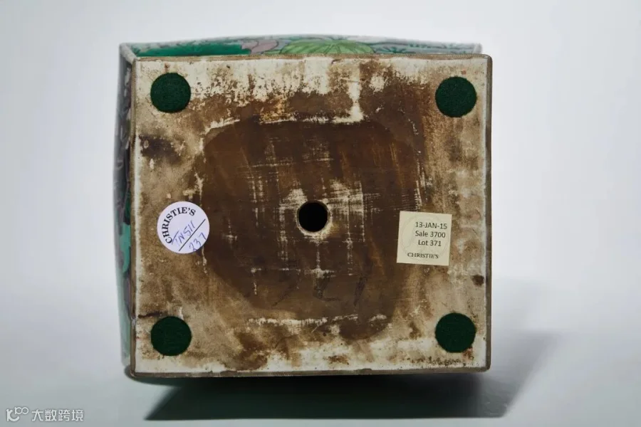 在中国古代瓷器制作过程中素有“一方顶十圆”之说,相对于拉坯成形的圆器而言,方器制作和烧造难度更大。本品器型周正,体量硕大而毫不变形,极为难得。目前所见清代墨地素三彩器,多为晚清所作,康熙作品极为少见,本品无论胎釉、用彩及画工的时代特征均极为明显,且通体纹饰构图饱满,主题突出,用彩精准,描绘精细,是极为难得的康熙墨地素三彩精品。