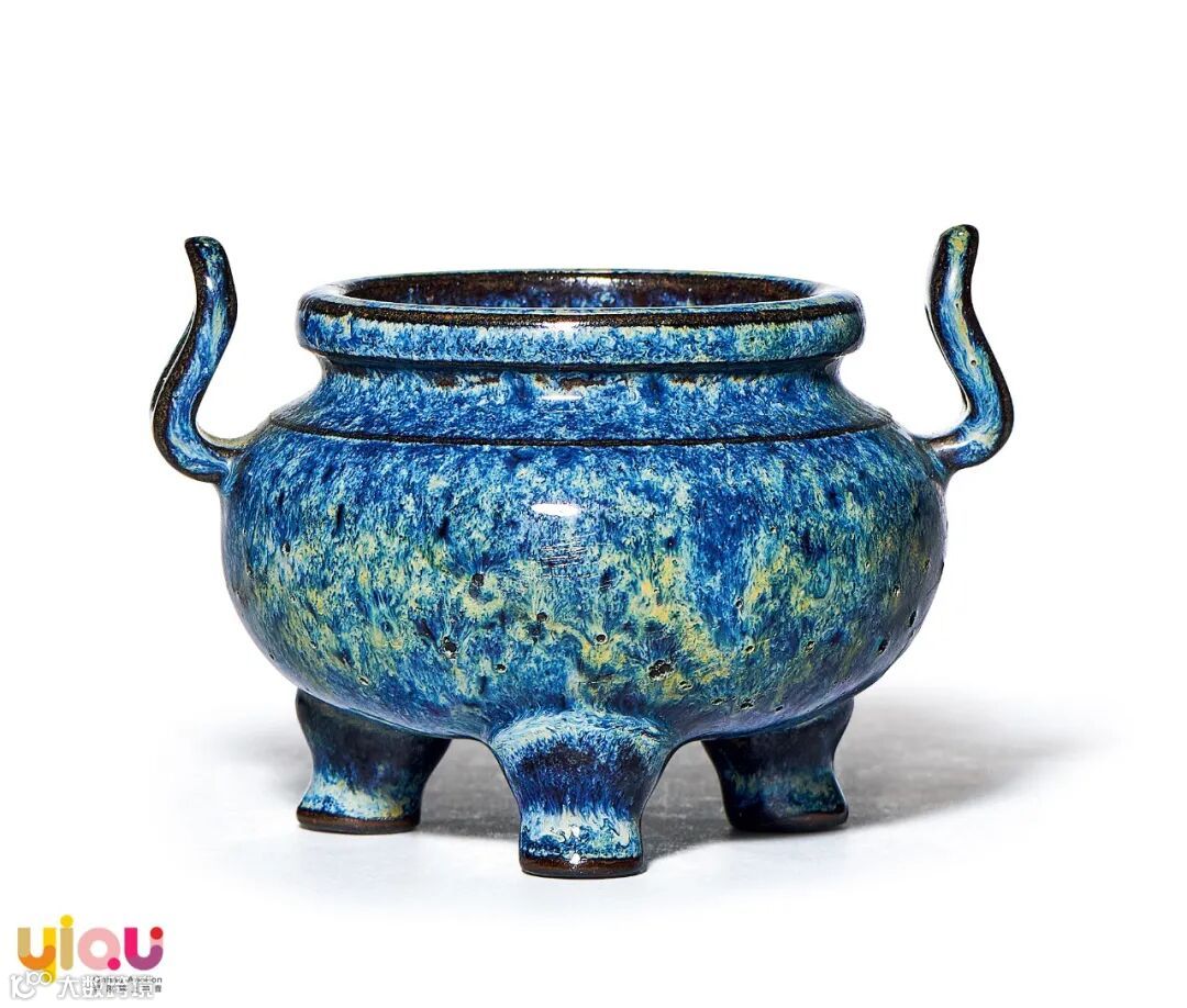 明代宜兴开始生产挂釉器,其中以仿钧釉品种具有相当的特色和知名度,名士王穉登在《荆溪疏》中记载:“近复出一种似钧窑者,获值较高”。此件宜钧香炉器身施蓝釉,色泽典雅高贵,釉层水润肥厚。唇口,束颈,鼓腹微扁,两侧置双耳,三足顺势而出,气宇轩昂,优雅恬淡。此炉敦实瑞丽,是为书房陈设之雅器。
