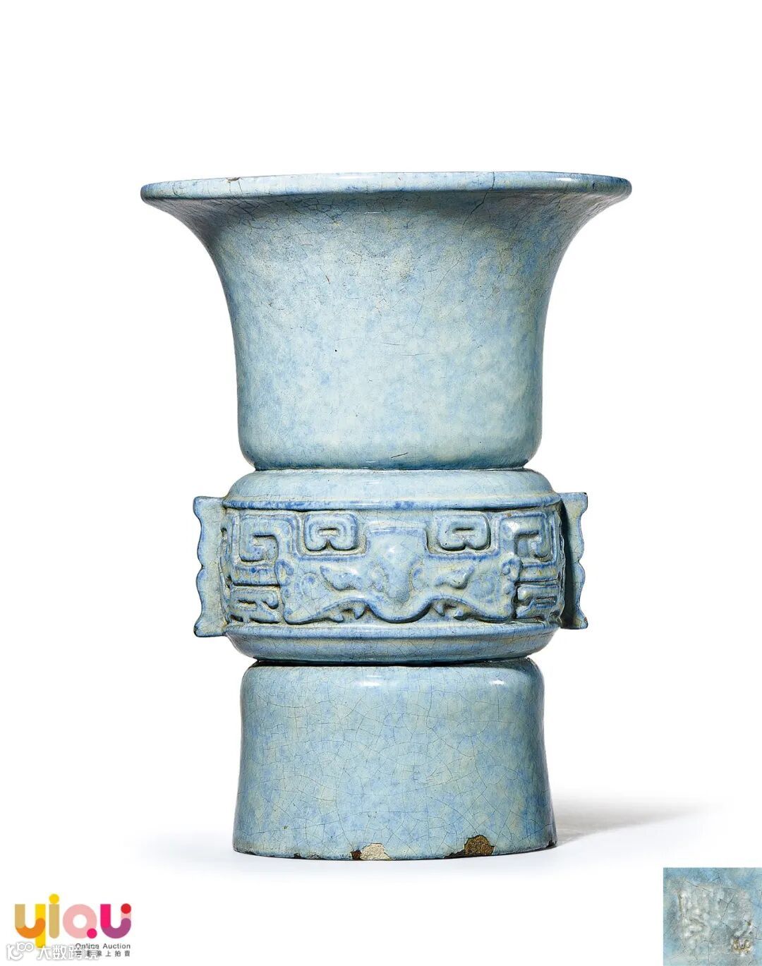 花觚为紫砂胎,仿青铜器造型,敞口,鼓腹,堆塑兽面纹并出脊,高足,足边露出褐色胎骨。通体施宜钧釉,釉层肥厚,乳浊感极强,形态自然,较为少见。