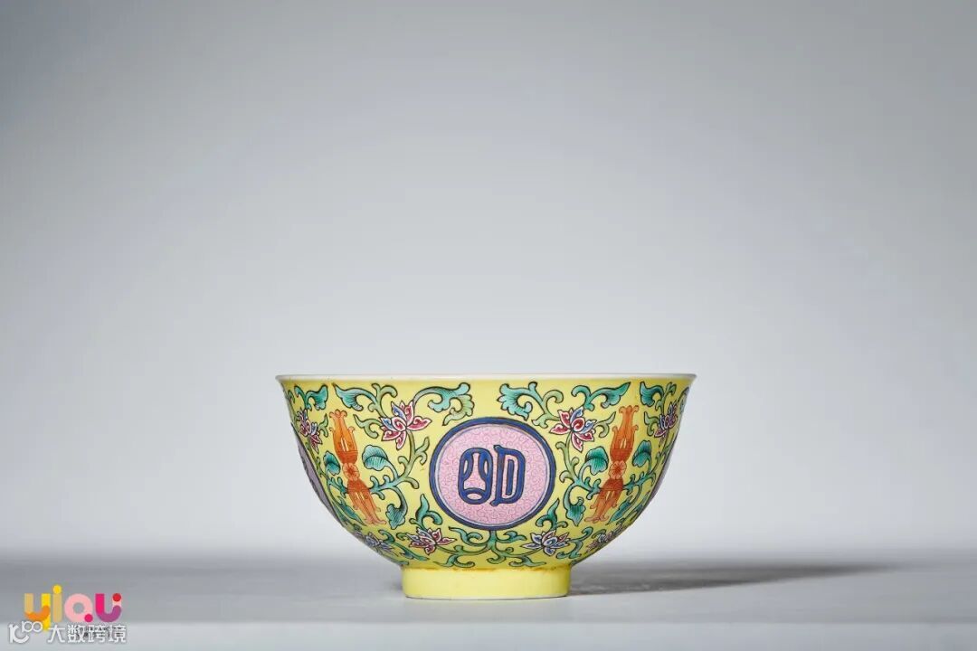 黄地粉彩描金五福捧寿图碗