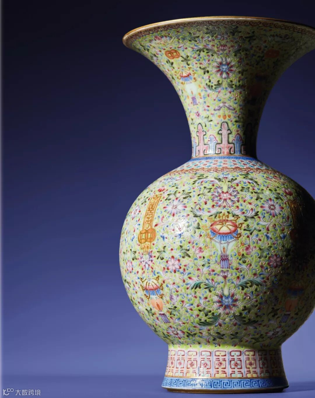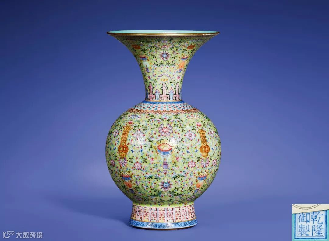 拍品口呈喇叭状,束颈,鼓腹,圈足。松石绿釉为地,器身以粉彩饰以缠枝西番莲纹。色彩鲜艳富贵,釉色粉嫩鲜亮,描绘细腻,寓意吉祥。施德之珐琅彩。器上的款识有“古月轩”、 “乾隆御制”、“团龙”、“团风”等。施德之,拉脱维亚人,日俄战争时期随军驻防东北,后到沪开设古玩行。他从德国进口珐琅彩料,重金礼聘原清宫造办处工匠胡氏(据传名胡颜标),仿制乾隆朝官窑精品,约作于1908-1913年之间。施德之除了从德意志进口珐琅料外,还有一部分是施氏通过清宫造办处责成匠工胡氏搜罗。其珐琅料,有数十种颜色。由于所用珐琅料之精少、名贵,施德之重金礼聘胡氏亲赴景德镇调制料色,其作业每一色料一次调成决无色差(从实物细部处可仔细观之)。施氏以五百两白银一件高价招揽了原御窑厂名匠潘甸宇作画。