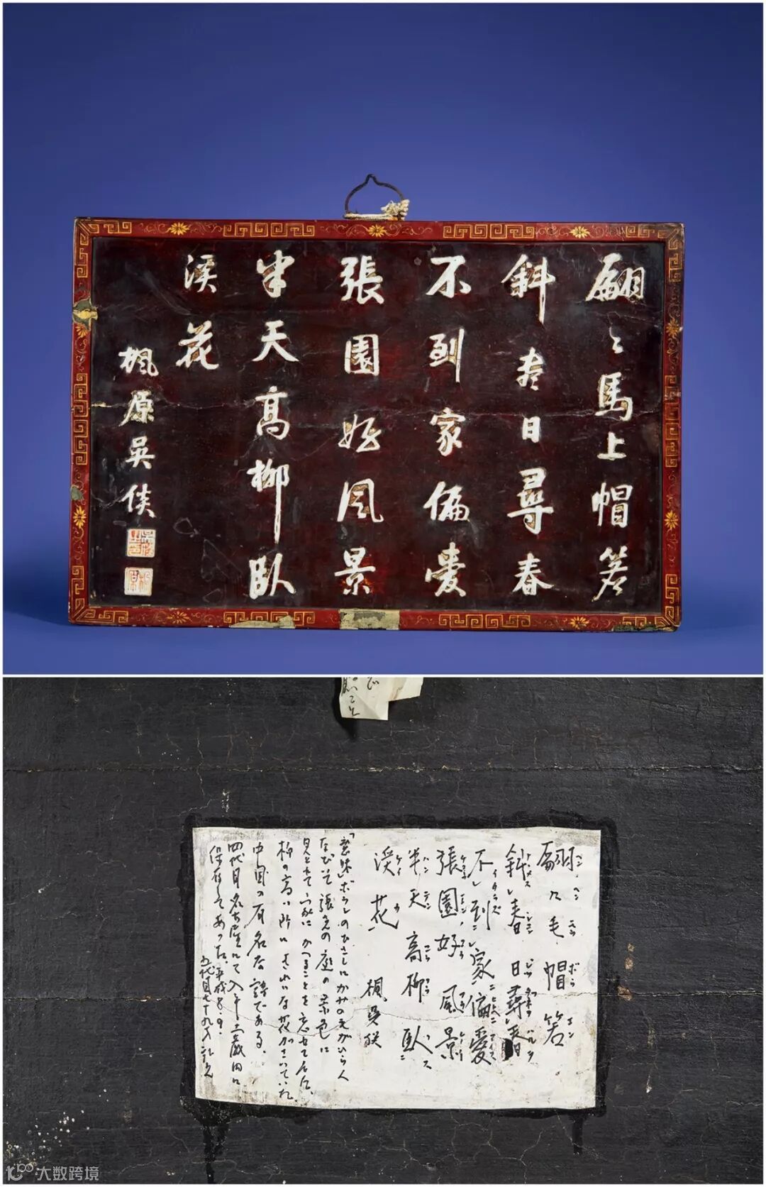 瓷板制作风格为典型的唐英制作,在当年唐英为身边的同好做了一批类似的诗文板,烧造难度极大,制作工艺极为考究,此件拍品最难得之处其外框为原配的朱漆描金外框,并且背后有原日本藏家的题签,可见当时前主人对其重视程度。