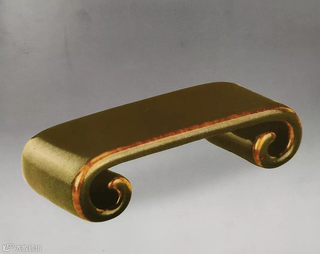 墨床造型呈书卷式,设计灵巧,床面平坦,兼具实用及赏玩价值。全器遍施茶叶末釉,几案边缘留有黄褐色轮廓线,有如古旧家具经年形成的磨痕。拍品虽为文房小器,却有大样,古朴而精雅,颇具文人意趣。沈阳故宫博物院藏有一只相类藏品,可兹参阅。