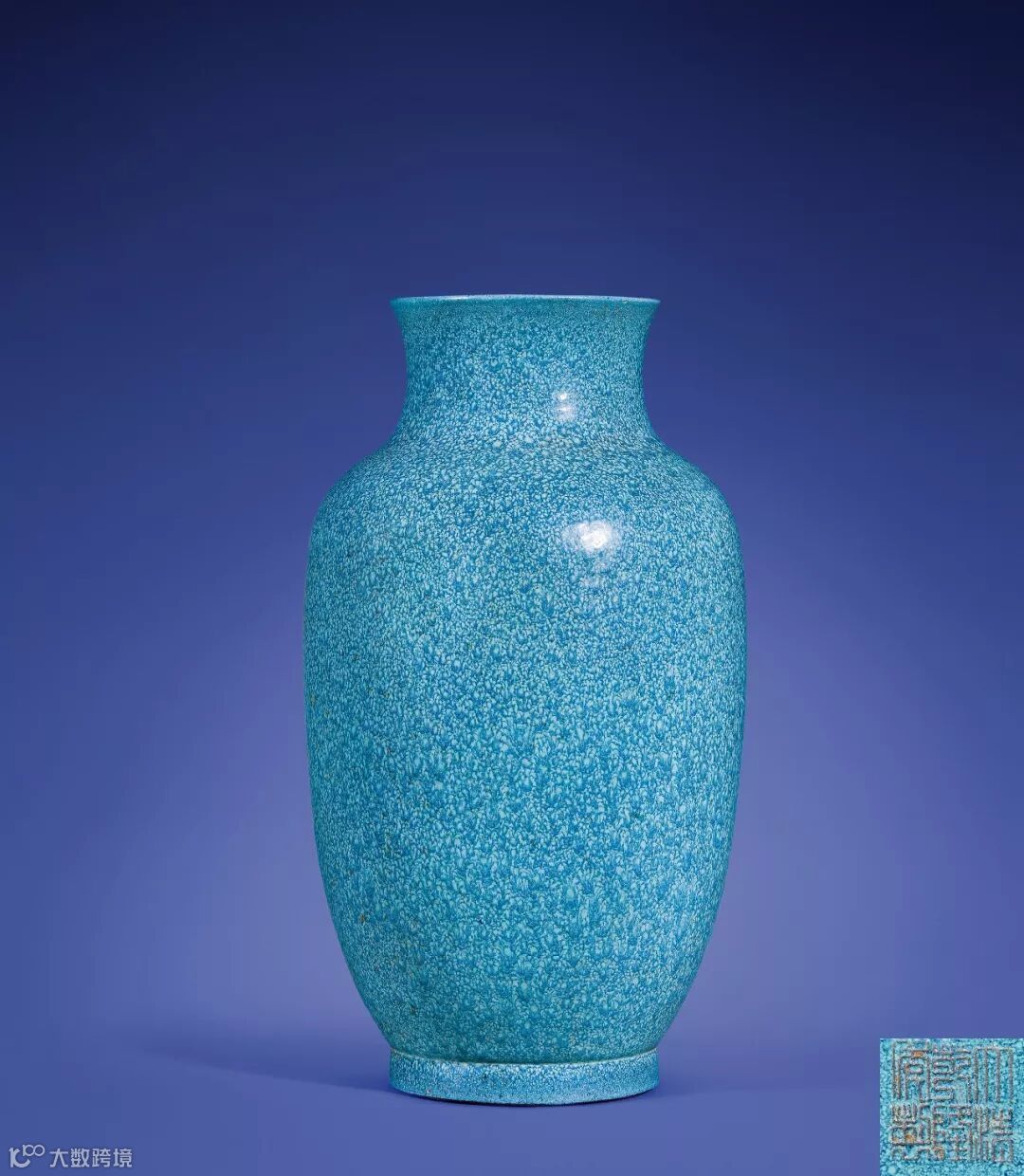 拍品品种为清代流行的一种瓶式,器形端正,呈灯笼状。通体施炉钧釉,釉彩自然流淌,蓝、紫、月白等色交织熔融,极尽变幻之能事。炉钧釉是雍正时期景德镇御窑厂创烧的低温釉新品种,此后延烧不绝。本品特殊之处在于以紫砂为胎,且篆刻与瓷器作品相同的乾隆官窑六字篆书款识,颇为少见。台北故宫博物院藏有与本品造型、尺寸相似的瓷胎作品,二者可资比较。