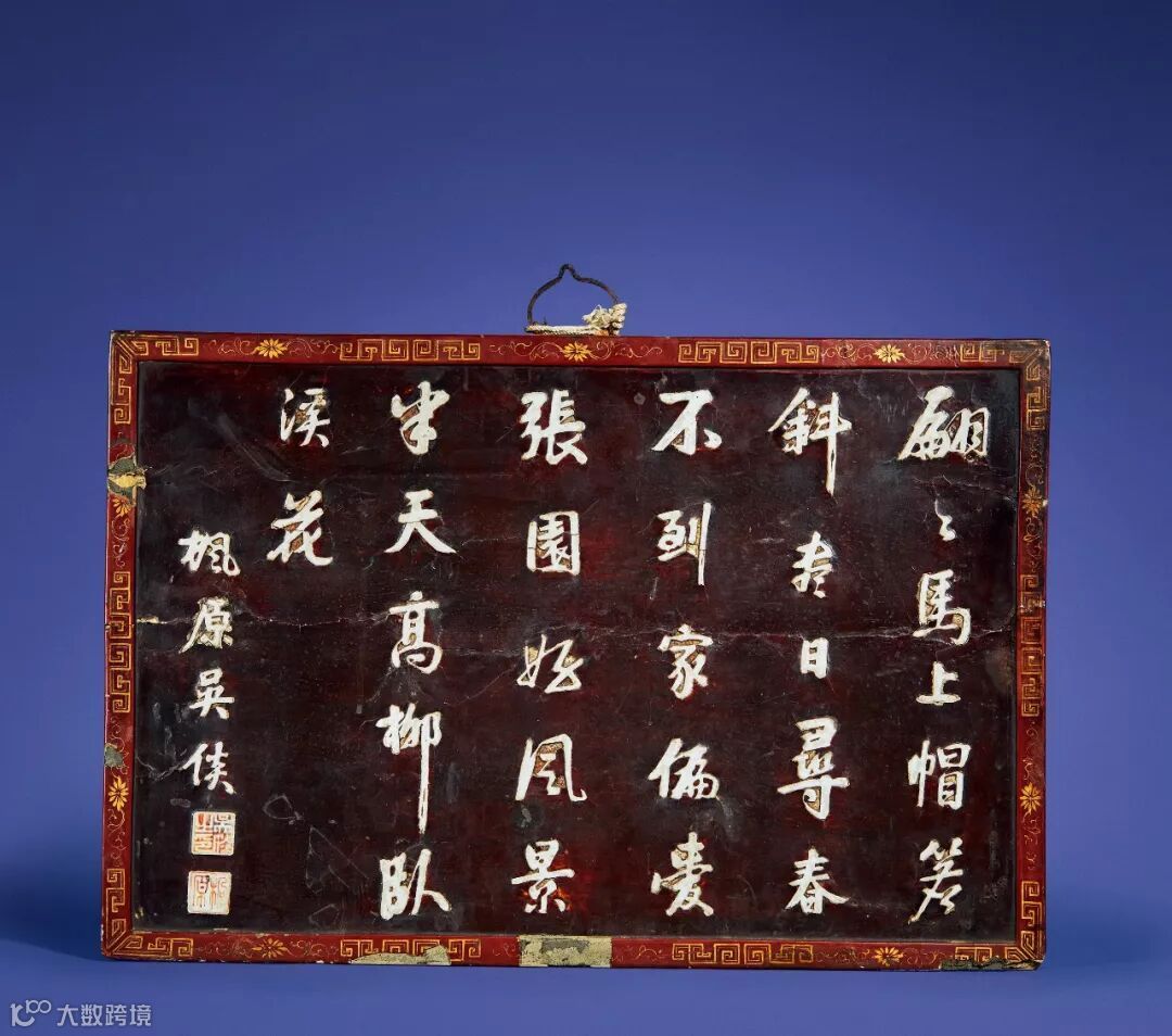 拍品以硬木为载体,上髹黑漆,嵌瓷诗句,样式古朴典雅,文气十足。所嵌诗文为南宋著名诗人陆游的《花时遍游诸家园·其三》 "翩翩马上帽檐斜,尽日寻春不到家。偏爱张园好风景,半天高柳卧溪花。"落款为枫原吴倓,阴阳纹印章“吴倓之印”、“枫原”。