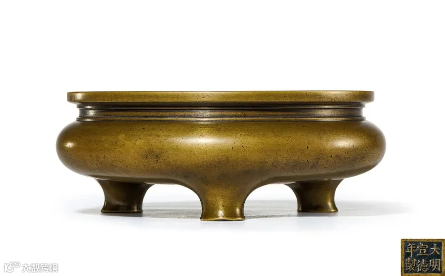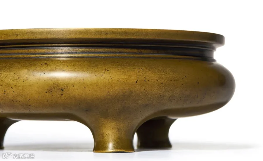 炉底面三足间开阔,微弧近平,落“大明宣德年製”六字楷书款,铸后直接奏刀刻出,字体颇有魏碑风骨,中宫内收,撇捺伸长,笔画粗韧,张立十足,笔意甚浓,地子不甚平整,显奏刀痕迹,不计工拙,看似随意,然仪轨森然,也可读出造款者匠心独具,为典型明代款式。