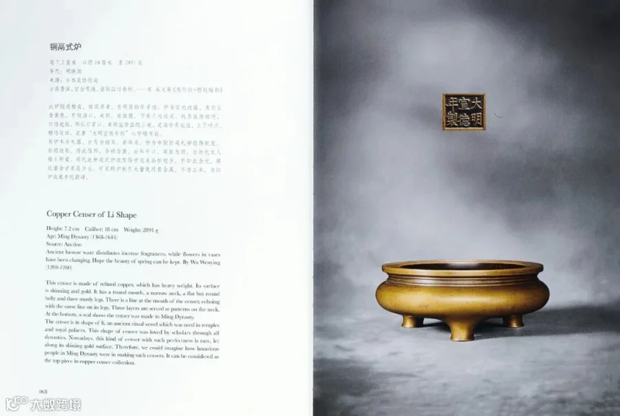 此炉造型周正温雅,为古製鬲炉中典型样式,既可以看到晚明时期宣德炉的製作既有上古三代青铜器之厚重、大器的特色,又有两宋时期人们对简约之美、内在之美、诗意之美的风韵塑形,极富张力的线条,刚中带柔,质朴的色泽,亮却不张扬,整体流露出简淡空灵的匠作神韵,形、色、款、质,均为上佳,宣炉中鲜见之作,或礼佛敬神,或玩赏焚香,堪为宝藏,传诸百代。