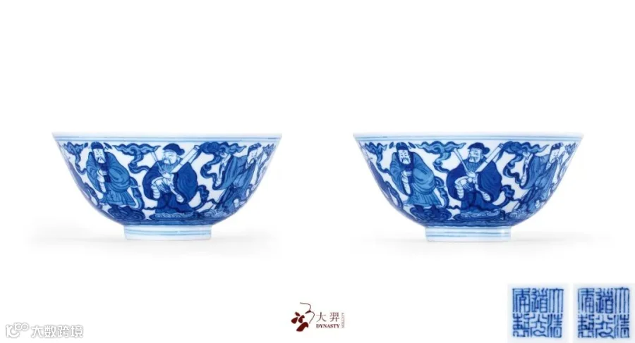 青花八仙人物祝寿碗一对 款识:“大清道光年製”六字三行篆书款 直径:10.8 cm. 来源:埃及私人收藏