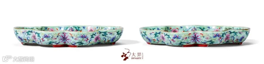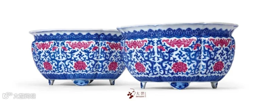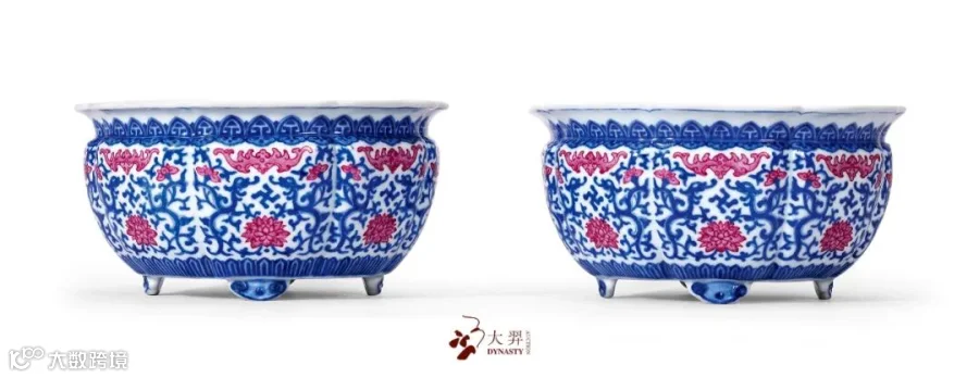 拍品造型与南京博物院藏粉红地粉彩福寿宝相纹葵花式花盆相类。折沿束颈,腹部外鼓,八出花口,成型难度极大。折沿处饰一周青花胭脂红彩折枝朵花纹,颈部以青花描绘蕉叶纹,下承一周如意纹。器身青花绘夔龙捧万字纹,间以胭脂红蝙蝠莲花纹样,红蓝两色相映成辉,寓意“万福连年”,独具匠心。胫部亦饰蕉叶纹,上下呼应。下承四如意足。全器纹饰于中国传统讲究对称、吉祥的布局中融入西洋洛可可风格,中西合璧,充满华丽富贵的气息。成对保存,颇为不易。