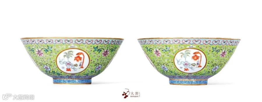 本品造型为清宫制器之典范,敞口微外撇,深腹,圈足,外壁以苹果绿彩为地,上饰洋彩缠枝花卉,四面圆形开光,开光处绘制博古图,如意、宝瓶、五谷、灯笼等吉祥图案寓意“五谷丰登”。图案对称分布,构图繁密,设色富贵华丽,尽显宫廷节令的喜庆气氛,为清宫上元节用器。底部书“大清同治年製”六字双行楷书款。