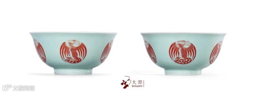 拍品撇口,弧腹,圈足。碗身内外施以豆青釉,碗壁用矾红绘制五组团凤纹,凤鸟展翅,凤目尖喙,羽丰尾长,仪表威仪。矾红是陶瓷低温釉上颜料,明代嘉靖时,御器厂以矾红釉取代铜红釉。到清代时,矾红的制作技术有了很大的进步,色泽鲜艳,华丽凝重。此对碗造型端庄稳重,图案规整,绘画生动,釉色纯正,与纤细的纹饰相衬,分外脱俗,寓意吉祥,是艺术及历史价值极高的收藏品。