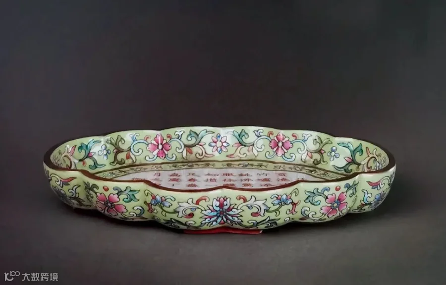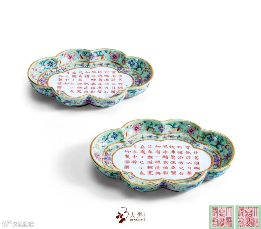 本品呈海棠形,口沿施金,浅腹平底,底部边沿随器形的曲折附对称四足。器内、外均饰绿地粉彩莲花纹样,器心海棠形开光内红彩书嘉庆皇帝御题诗文:“佳茗头纲贡,浇诗月必团。竹炉添活火,石铫沸惊湍。鱼蟹眼徐漂,旗枪影细攒。一瓯清兴足,春盎避轻寒”,描绘了春夜皇帝品缆新茶之情景。文后落“嘉庆丁巳小春月之中澣御製”款,下绘圆形“嘉”、方形“庆”朱文印章。