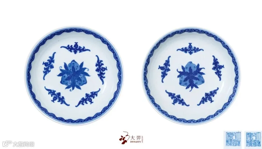 青花蚕纹寿字盘为清代官窑经典品种,拍品与上海博物馆藏品品种相同,内壁及盘心绘蚕纹变体寿字,外壁饰如意贯套纹,寓意吉祥长寿。形制规整,构图疏朗典雅,青花发色浓郁清丽,尽显青花瓷器秀美端庄之风韵。东周和两汉时期流行鸟虫书,其字形华丽,富有趣味性和装饰效果。拍品以蚕纹组成寿字,颇具鸟虫书之遗风。成对保存良好,较为难得。旧配锦盒。