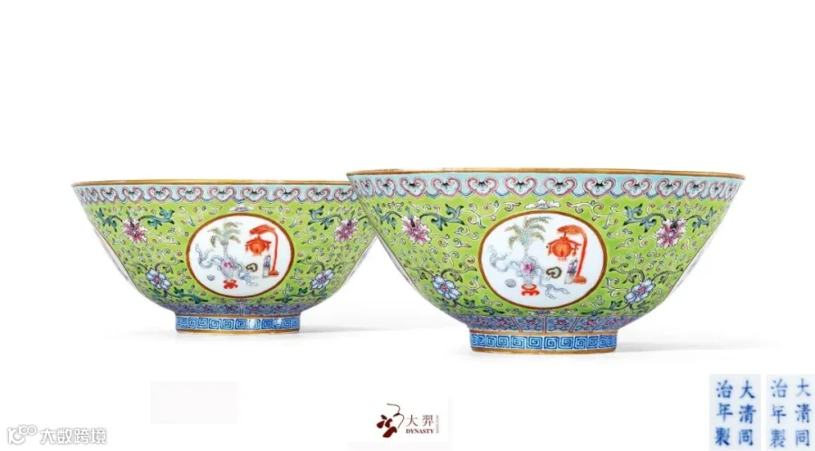 苹果绿地粉彩开光五谷丰登图碗一对 款识:“大清同治年製”六字双行楷书款 直径:15.5 cm. 来源:陕西文物公司旧藏