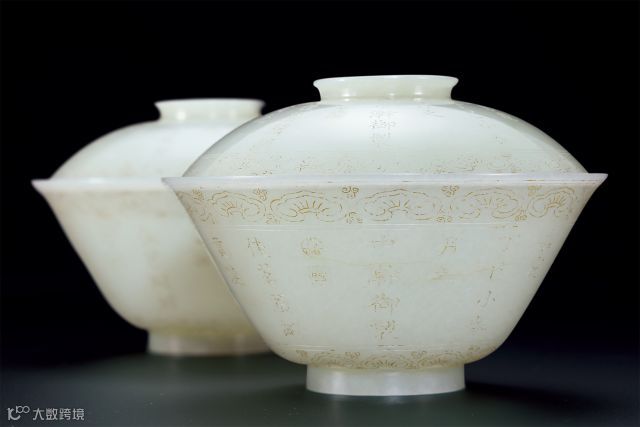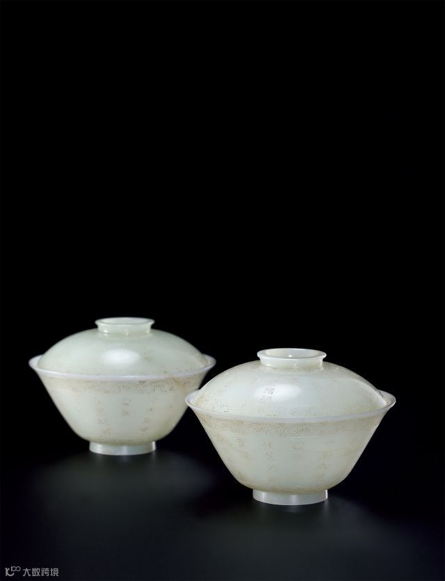 清嘉庆 御制白玉御题诗文盖碗(一对)