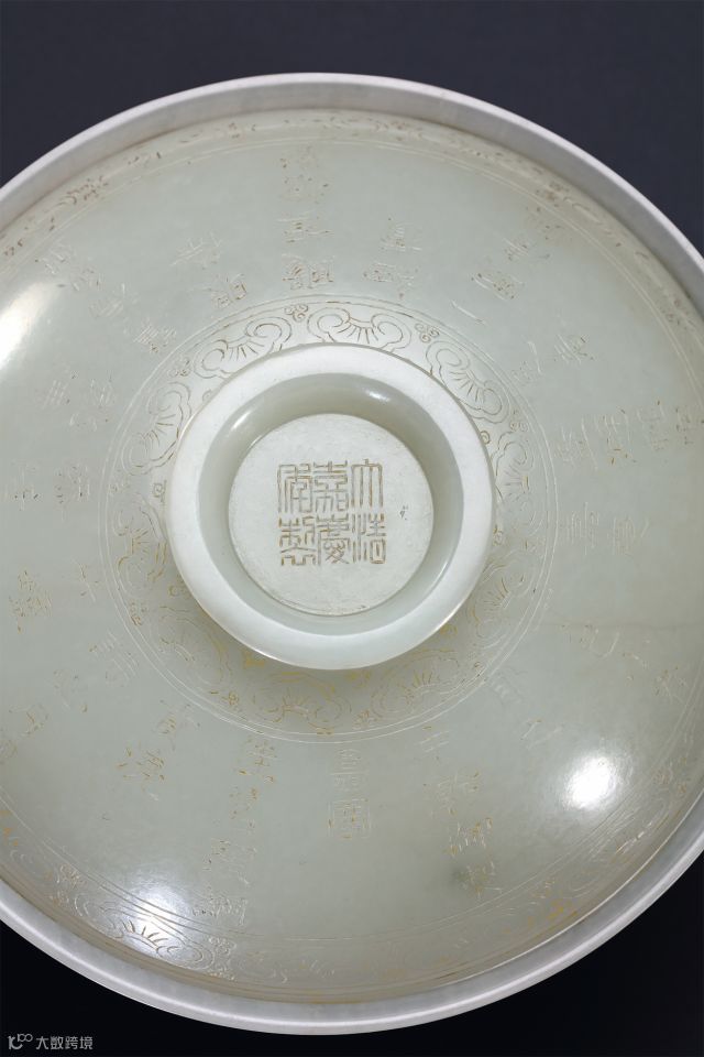 此对盖杯用整块白玉雕琢而成,选材极佳。杯身外壁上下饰如意云头纹,中间留白处刻嘉庆皇帝御题诗文并填金作:『佳茗头纲贡,浇诗月必团。竹炉添活火,石铫沸惊湍。鱼蟹眼徐漂,旗枪影细攒。一瓯清兴足,春盎避轻寒』,描绘了皇帝品览新茶之情景。