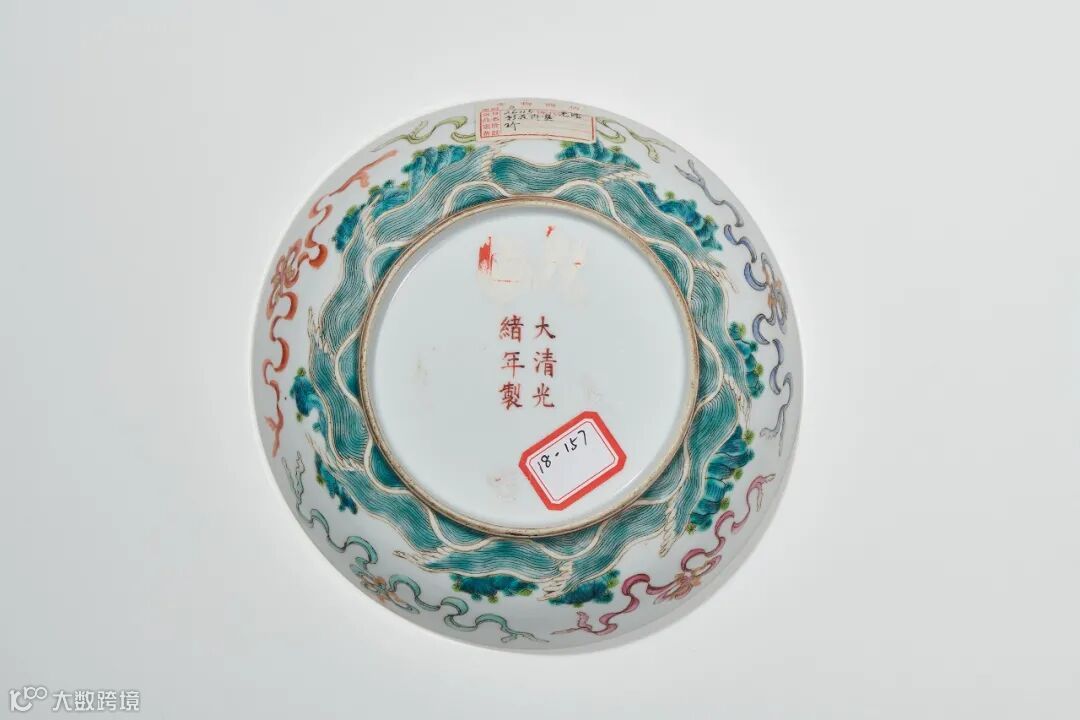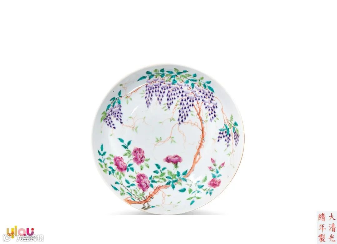 此盘为光绪时期官窑传统经典制式,内外满施白釉,内壁粉彩绘紫藤花卉,外壁绘江山万代纹,外底心矾红彩书“大清光绪年制”六字双行楷书款。