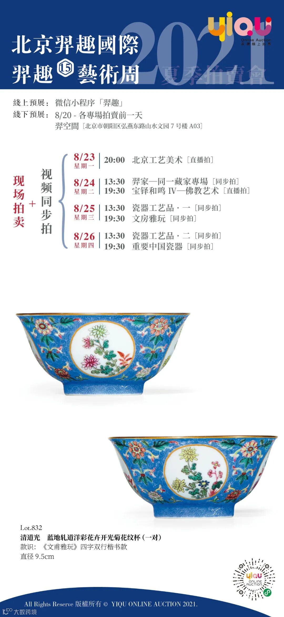 “重要中国瓷器”专场,共80余件,涵盖名家旧藏之明清瓷器、文房雅翫等各式佳作。拍品皆经高标准遴选,精美佳器,精彩纷呈。未能到场的藏友也可通过【羿趣】小程序尽情查阅拍品信息及品相。“重要中国瓷器”专场将于8月26日(周四)晚七点半正式举槌,诚邀广大藏友的关注和支持!