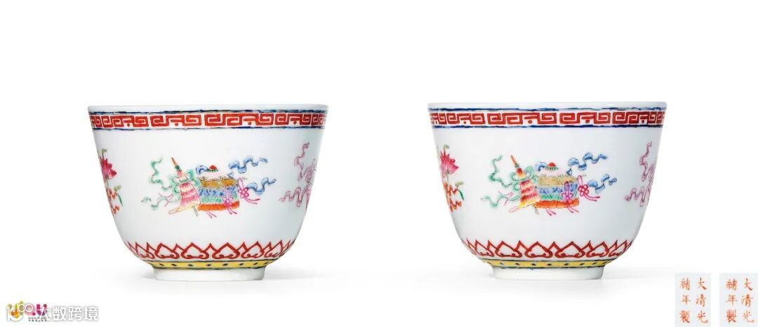 自嘉庆始,清廷国力日衰,窑务废弛。由于经费十分紧,加之人工原料费用逐年增长,故而官窑质量大不如前,咸丰年间由于太平天国战争,御器场被焚毁,直至同治初年才重建。同治光绪在位期间祭典、大婚等活动较多,加之国力有了一定的恢复,“同光中兴”的格局使得清廷有充足的财力烧瓷,据《清档·内务府工业清册》记载,光绪间曾多次为慈禧寿辰烧制瓷器,制作水平极高,在晚清瓷器中鹤立鸡群。其中仿康熙、乾隆的精品已经达到了康熙、乾隆瓷的水平,堪为晚清中国手工制瓷的巅峰之作。本次“重要中国瓷器”专场就有多件来自光绪时期的佳器,其中LOT816 清光绪 粉彩八吉祥纹杯器型典雅,构图疏密有致,画工精细,色彩艳丽,胎质洁白细腻,釉水莹润,是晚清官窑粉彩传统器中的典型器。