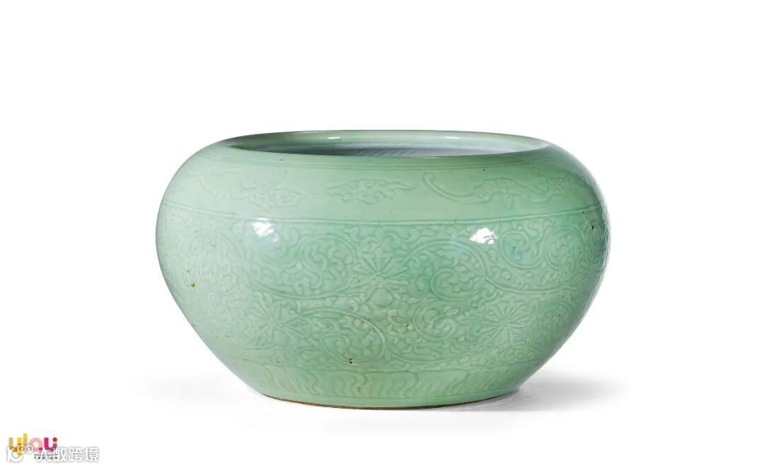 钵式缸敛口,鼓腹,腹下渐收,内挖圈足。通体罩施青釉,釉面匀净坚致,釉下暗刻纹饰,口沿处装饰一周云蝠纹,腹部刻画细密的缠枝莲纹,足胫部则以葵瓣纹为衬托。整体图案布局妥帖,纹样精湛,颇富立体感。清代青釉器的烧造肇始于康熙,极盛于雍干,清档中还有“粉青釉凸花缸”之记载,本器即应属此类,可资比较。整器体量硕大,胎体厚重,釉质温润光泽,釉色素雅内敛,为清代中期色釉瓷之佳器。
