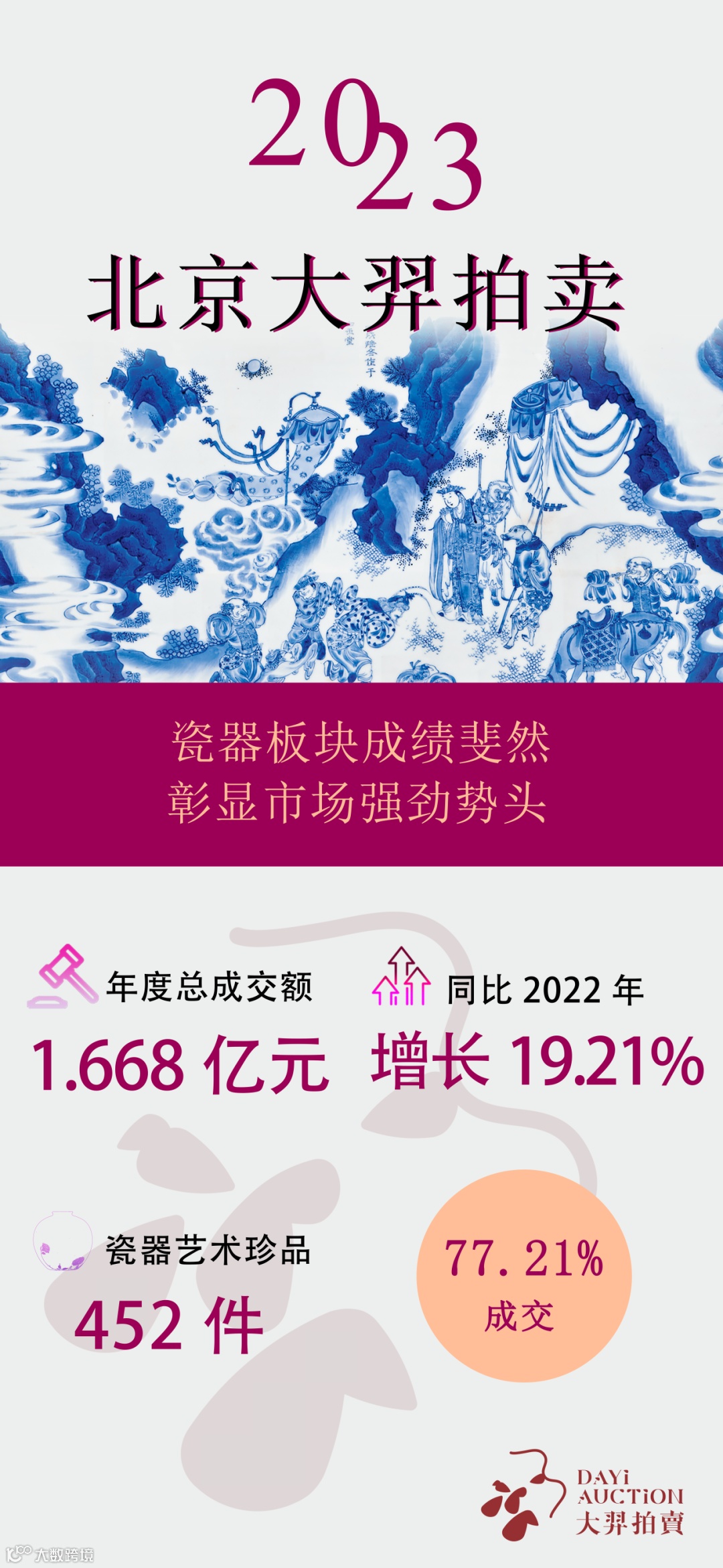感谢各位藏友2023年的相知相伴,北京大羿2023年度收获年度总成交额逾1.668亿元,40件拍品破百万,总成交率为77.21%。同比2022年度,总成交额增长19.21%,可见文物艺术品拍卖市场基本恢复至疫情前的状况。由于外部经济大环境的影响,收藏家们的理性消费致使市场交易率走低,但整体成交额保持增长势态,多件珍品溢价成交,刷新多个成交记录,对2024年的市场行情产生积极推进的作用。