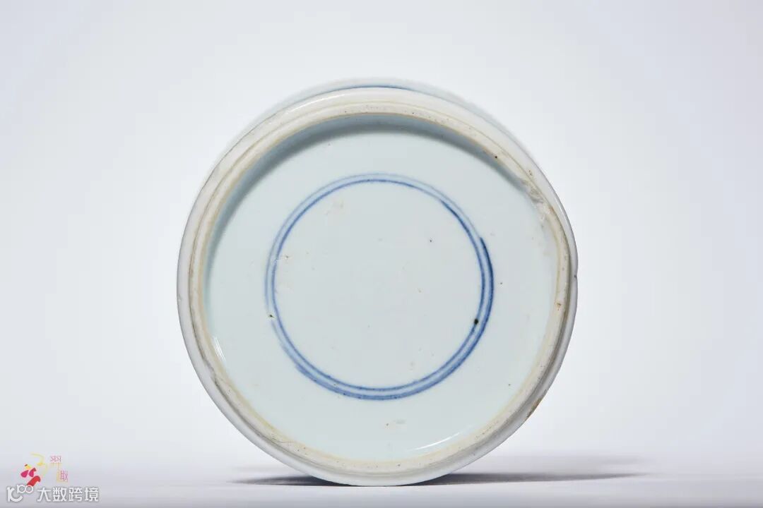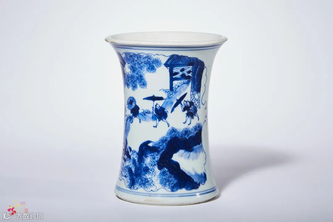笔筒作束腰形,撇口,腹部内收,足部外撇,胎质细腻,形制规整。器身开光以青花绘人物故事图,线条流畅洒脱,人物衣纹飘逸,青花淡雅素丽,浓淡渲染层次分明,纹饰描绘精细。