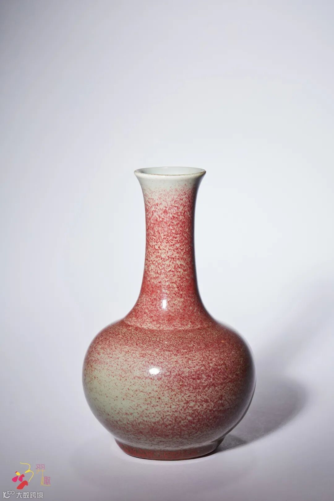 拍品撇口,束长颈,圆腹,圈足。器身线条流畅自然,釉料汁水莹润,红釉流淌自然,红白交织而精神灵动。此瓶为一件陈设精品,可用作插花之器,满室盈芳。