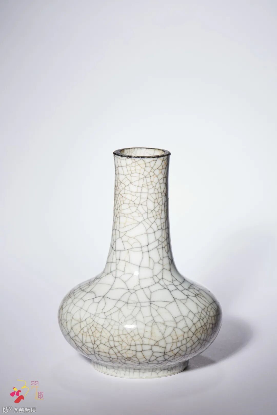 拍品直长颈,扁圆腹,圈足。器身施仿哥釉,开片呈深浅两色,颇具意趣,釉质肥厚,葆光内蕴。整器造型小巧,古意盎然。