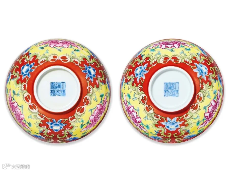 此式洋彩宫碗为道光御窑延续乾隆之作,集皇家华贵之气与文人儒雅之气于一身,其制作工艺精湛,胎釉质色俱佳,底部青花书「大清道光年制」六字三行篆书款。