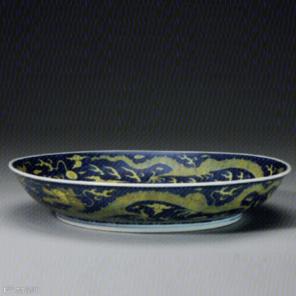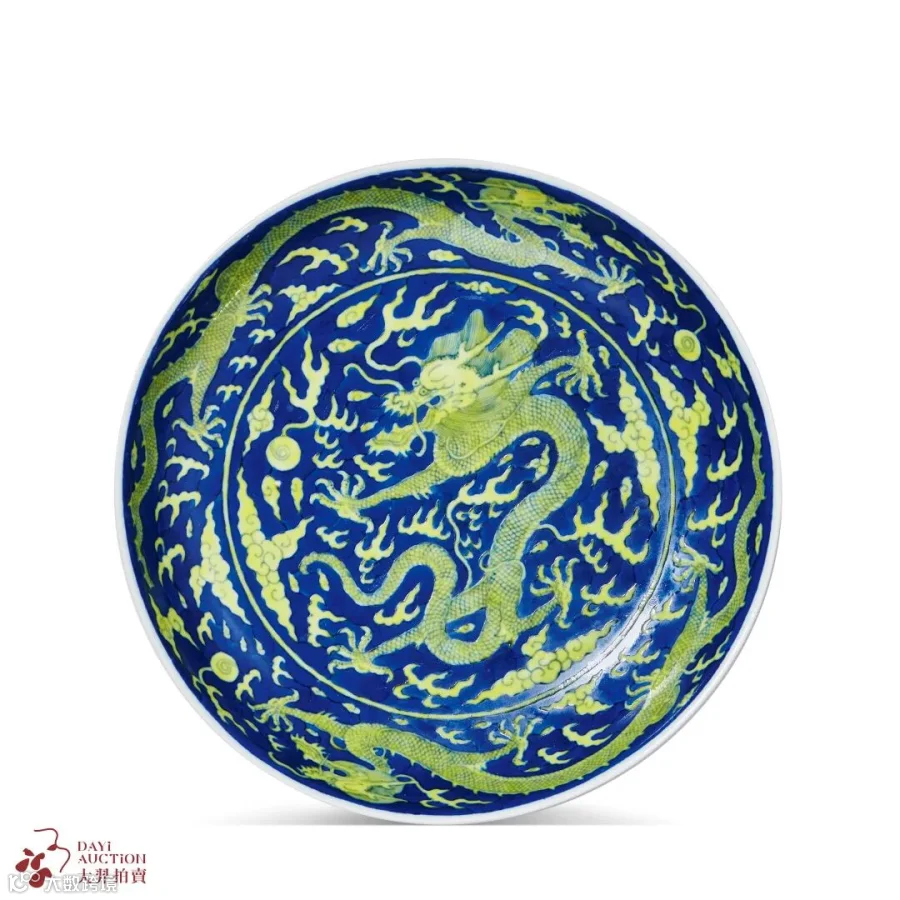 拍品圆口,弧壁浅腹,圈足。盘内外壁均以蓝釉为地,纹饰为黄彩龙纹,外壁两条五爪行龙互相追逐,体态矫健,昂首向前,行龙间以云纹与火球,盘心作黄彩立龙戏珠,整器纹饰庄严,成对骈出,颇为珍贵。据《国朝宫史》所载,清宫中皇帝、皇太后、皇后使用里外皆施黄釉的瓷器;皇贵妃用外黄内白的瓷器;贵妃、妃子使用黄地绿龙瓷器;嫔用蓝地黄龙瓷器。由此可见清宫等级制度之森严,用瓷法度之健全繁细。