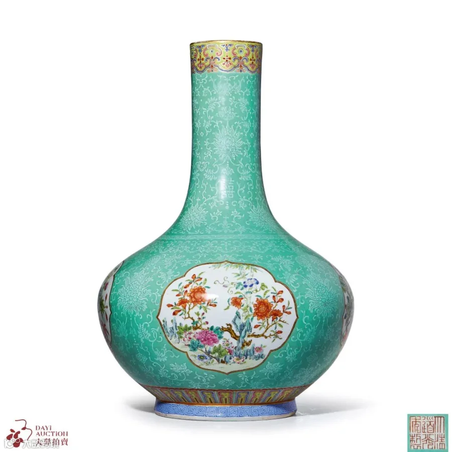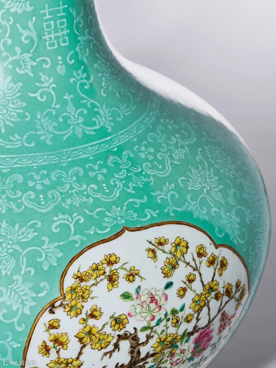 拍品直口,直颈,溜肩,鼓腹,圈足。通体满施松石绿釉,上以堆白技法装饰缠枝宝相花纹,并有蝙蝠、磬、双喜字等吉祥纹样点缀其间,纹饰繁狡,对称规整,装饰效果强烈。腹部四组四合如意式开光,金彩描边,内填粉彩花卉图,百花盛开,繁花似锦。胫部绘莲瓣纹,足墙蓝料彩绘回纹,与口沿黄地粉彩如意贯套纹相呼应。金彩口,平添华美之姿。