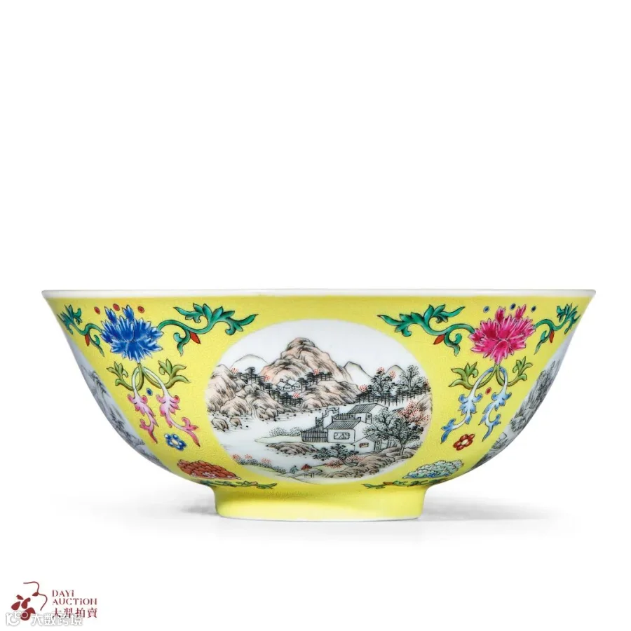 碗心料彩绘宝相花,在素白瓷胎映衬下愈显华丽。碗外壁以黄釉轧道为地,锥剔卷草纹,娇嫩华贵,富丽堂皇。釉上留白四个开光,圆形开光内以粉彩绘文人四季逸事:踏雪寻梅、携琴访友、寒江独钓、楼阁静思四图。衡其画法,则整饬工致,论其彩色,则鲜妍夺目。意境颇见逸致,深具国画风骨,淡洁高雅,格调清新脱俗,宛如宋人小景绢画。开光之间勾绘各式西洋花蔓纹饰,色彩斑斓,争妍斗芳。
